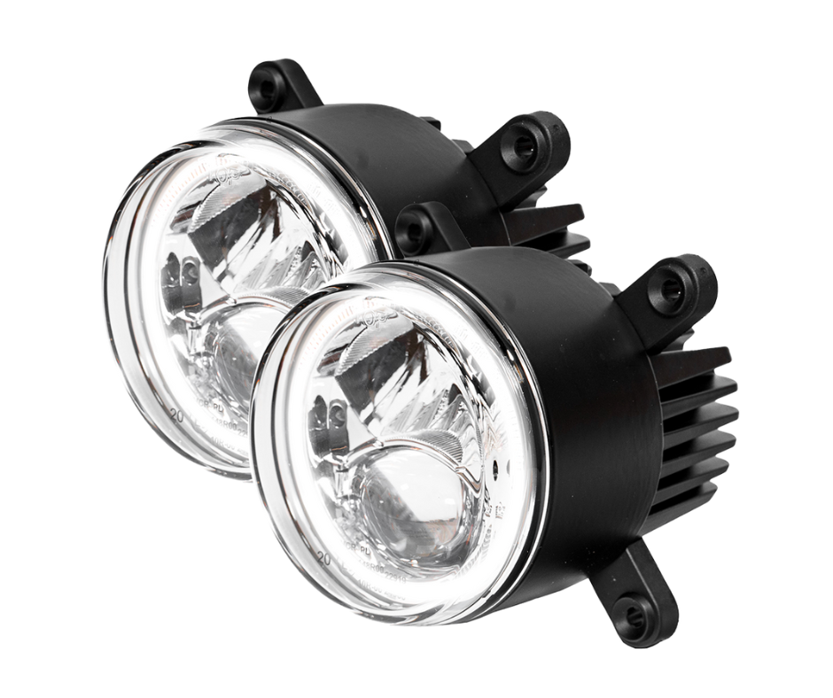 Transform your Fendt’s lighting with the CRAWER Hyperios LED headlight set with Angel Eyes — a complete, high-performance lighting solution combining low beam, high beam and an eye-catching halo position light in one premium unit. Designed specifically for Fendt tractors with 90 mm round headlamp openings, this set includes ND7 adapter cables for true plug-and-play installation with no modification to the original wiring.